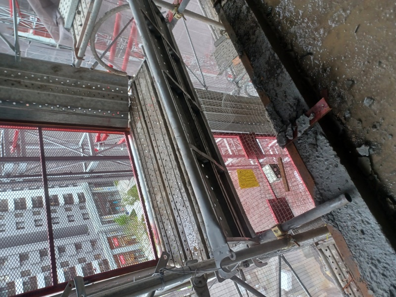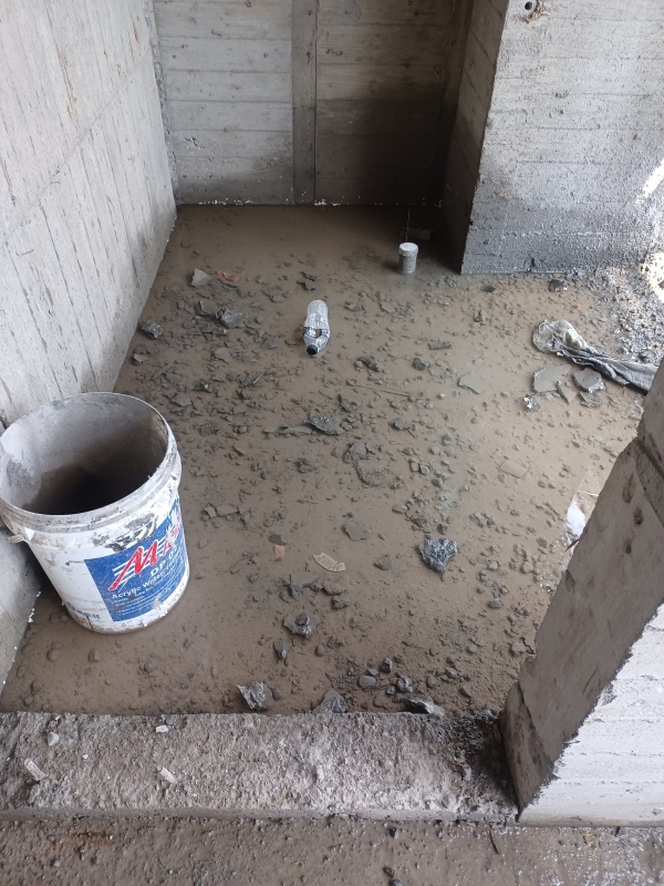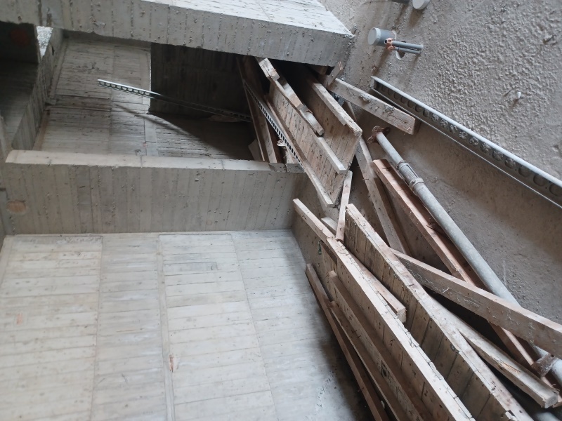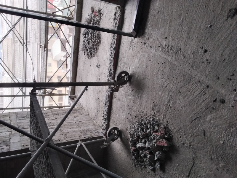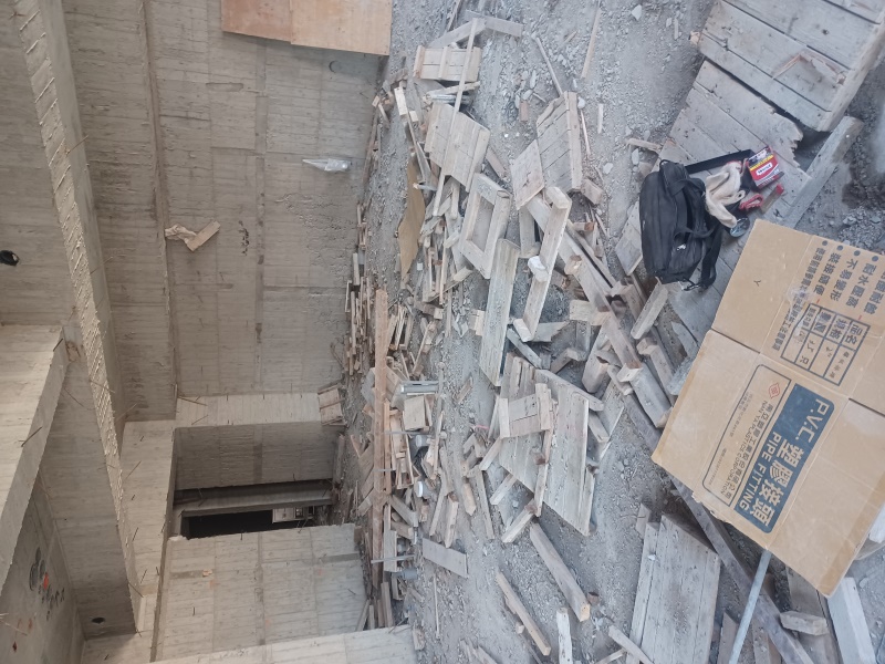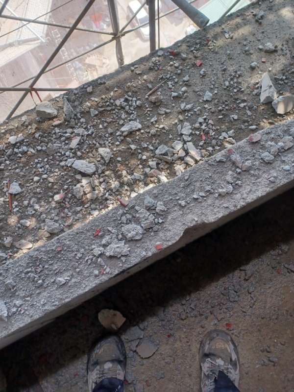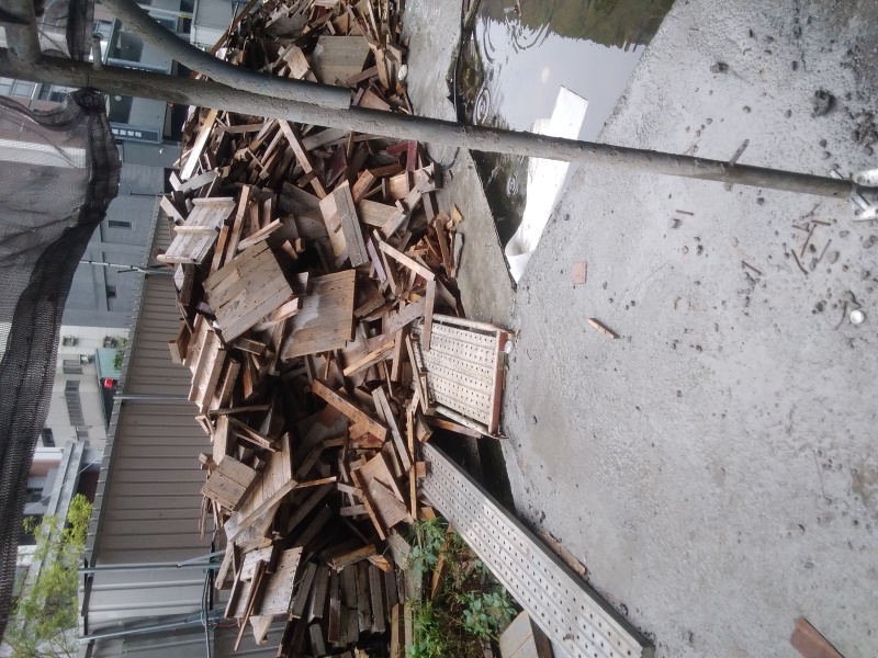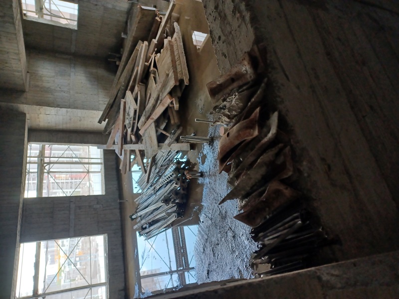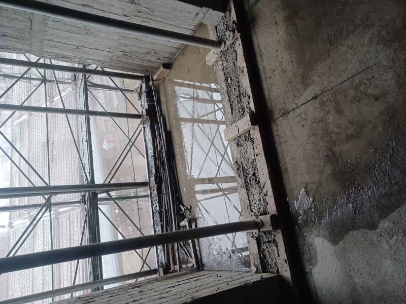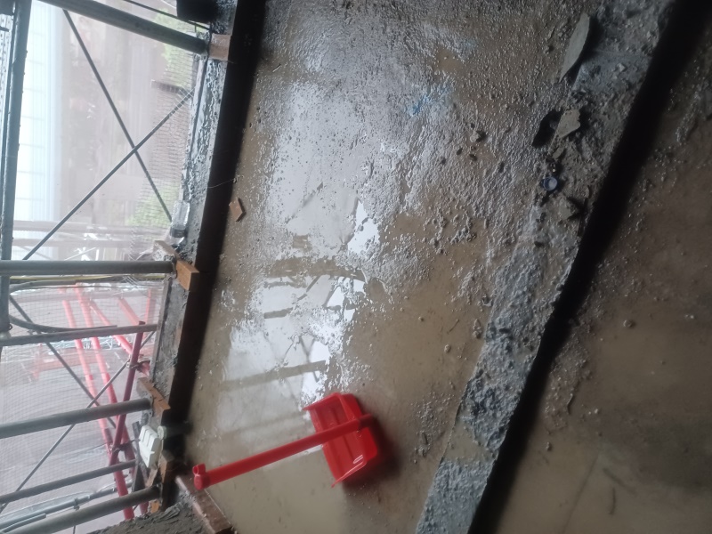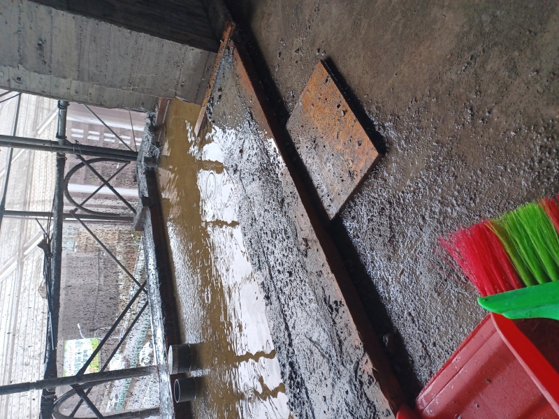 建物の型枠解体、バルコニーのグラウト注入、資材の整理