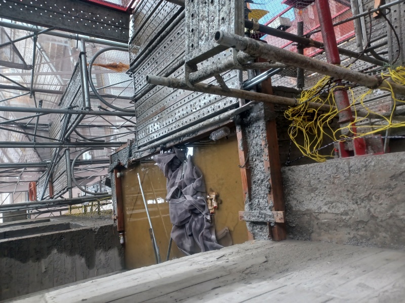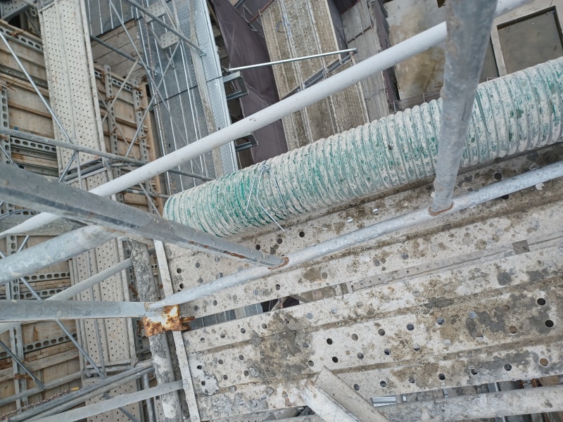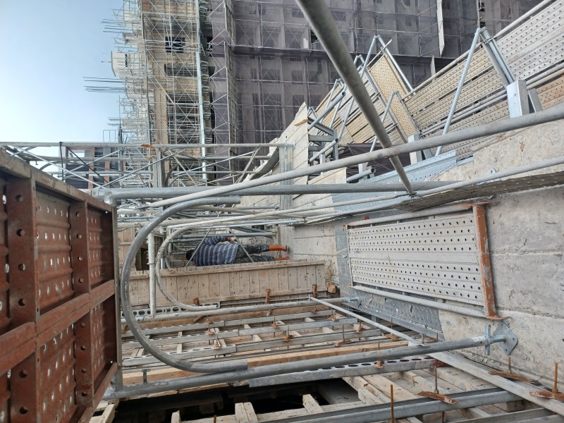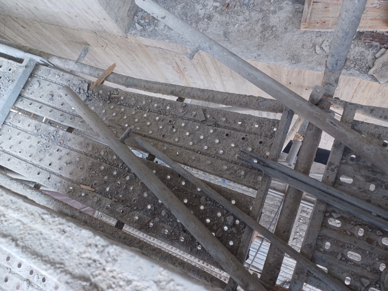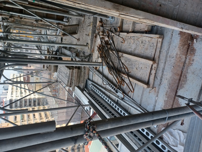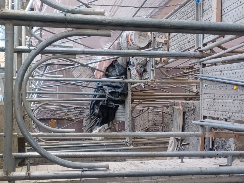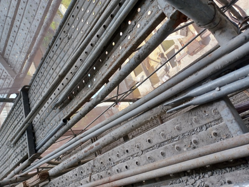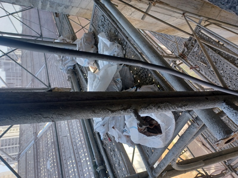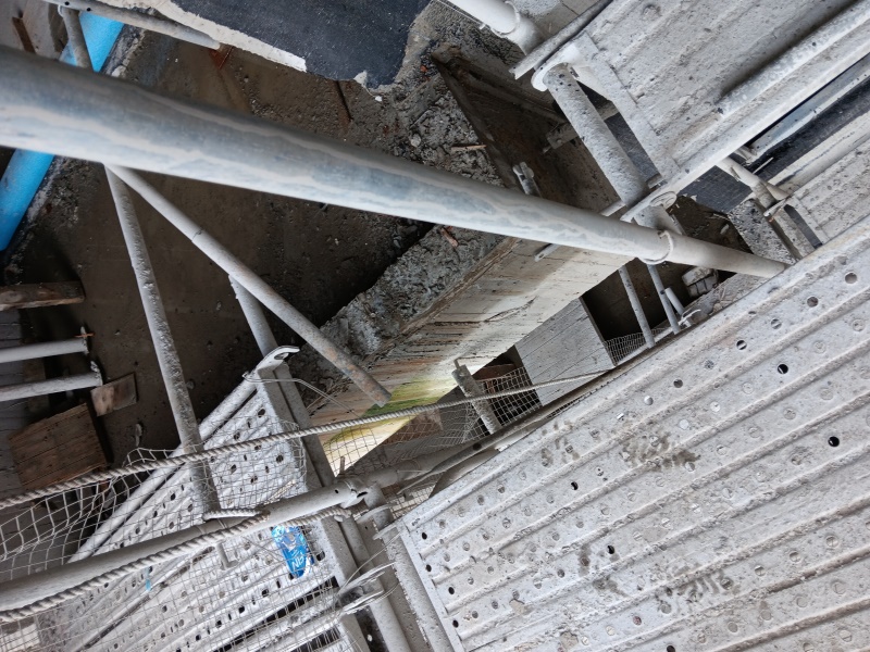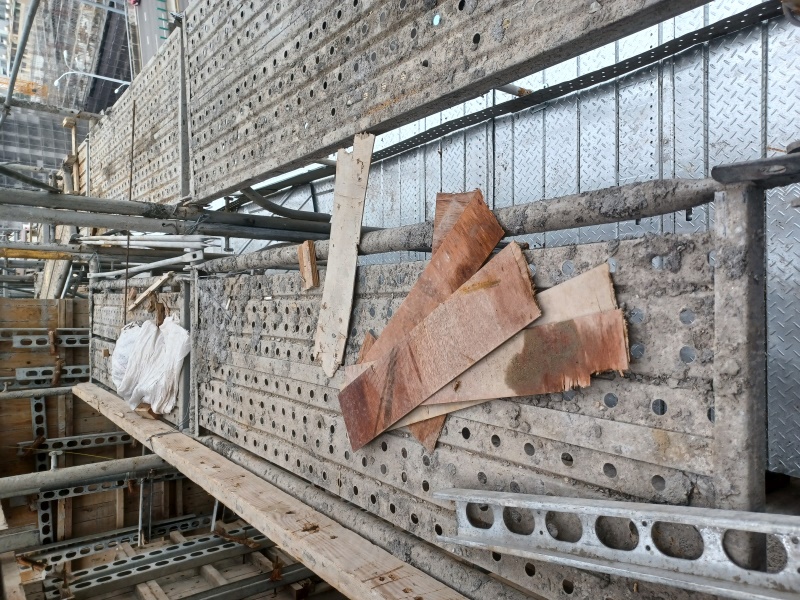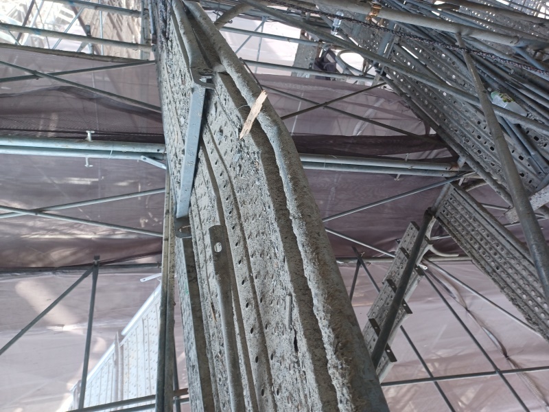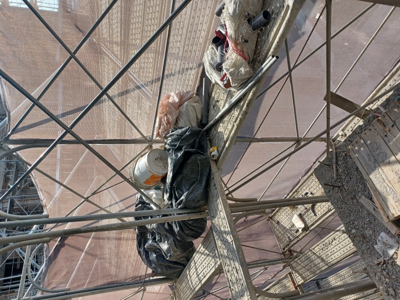 建物の型枠解体、バルコニーのグラウト注入、資材の整理